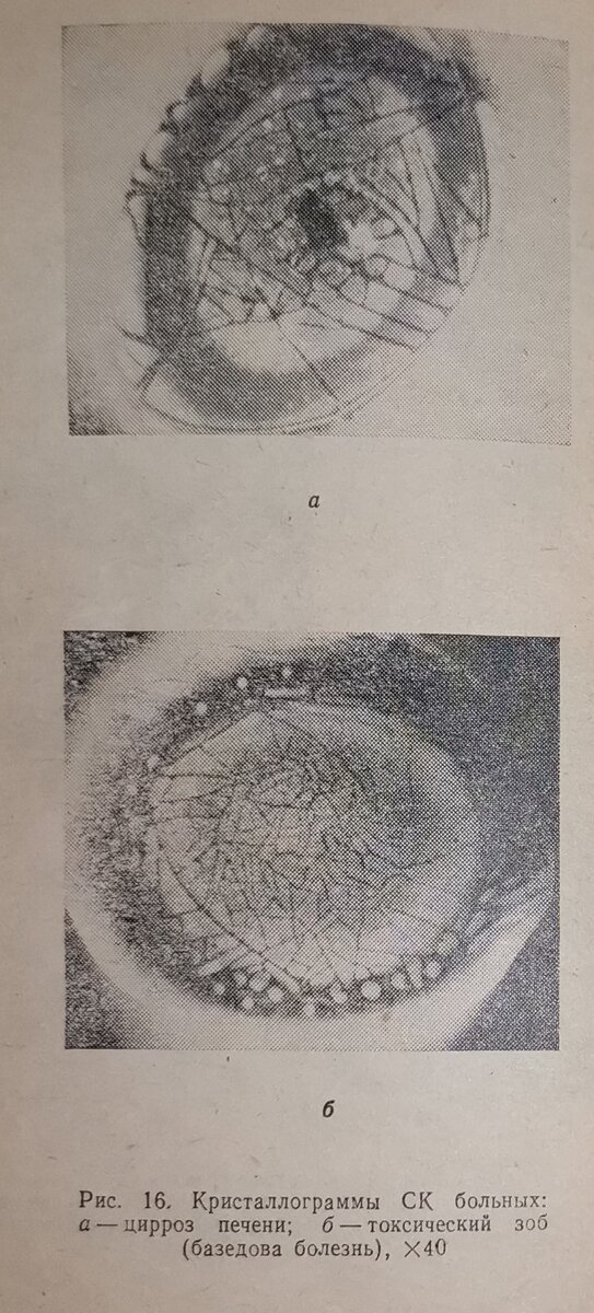 Еще в 1992 году попалась на глаза книжка Л.В. Савина КАМНИ ЛЕЧАТ И РАССКАЗЫВАЮТ, ПЕРМЬ, 1992 Заинтересовал раздел "Кристаллоскопическое исследование сыворотки крови человека" Показано, что кристаллограммы высохшей сыворотки крови человека отражают своей структурой, еще до сильного их проявления, все актуальные современные заболевания, как сахарный диабет, токсический зоб, ишемическая болезнь сердца, системные заболевания соединительной ткани, болезни крови, хронический гепатит, цирроз печени и т.д. Метод кристаллографии крови - оказался простой и сравним с обычным анализом крови при проведении ДИСПАНСЕРИЗАЦИИ, но обладает большей информативностью. Примеры 1992года. Высушенная сыворотка крови под микроскопом, увеличение х40 Высушенная сыворотка крови под микроскопом Прошло 30лет..... за это время метод КРИСТАЛЛОГРАФИЧЕСКОГО исследования крови получил дальнейшее развитие, например книга Диагностика по капле крови.Кристаллизация биожидкостей.Книга 1 Кристаллизация сыворотки крови мето