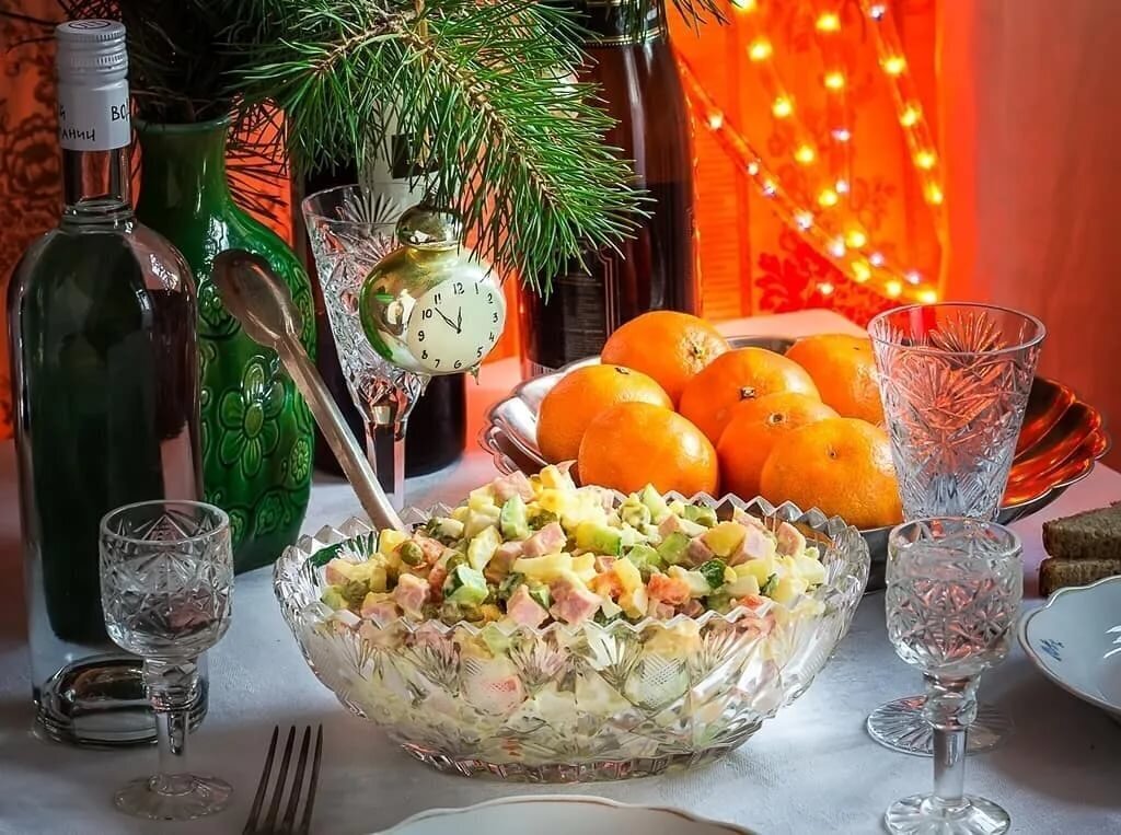 Новогодний стол — это не только кулинарное изобилие, но и часть праздничной атмосферы. В разных странах предпочтения могут отличаться, но некоторые блюда стали классикой праздничного застолья. Вот список топ новогодних блюд, которые часто можно встретить на праздничных столах: Закуски 1.Оливье — салат с картофелем, морковью, горошком, колбасой или варёным мясом, яйцами и майонезом. 2.Сельдь под 'шубой' — слоёный салат с сельдью, свёклой, картофелем, морковью и майонезом. 3.Рулетики с красной икрой — закуска из блинов или тостов с маслом и икрой. Горячие блюда 1.Запечённая утка или гусь — часто подаются с яблоками или картофелем. 2.Жульен — грибной или мясной, запечённый в горшочках с соусом и сыром. 3.Шашлык — маринованное мясо, жареное на гриле или мангале, популярно в странах СНГ. Салаты 1.Винегрет — салат из свеклы, картофеля, моркови, горошка, квашеной капусты и растительного масла. 2.Мимоза — слоёный салат с консервированной рыбой, тёртым яйцом, луком и майонезом. Гарниры 1.Медово