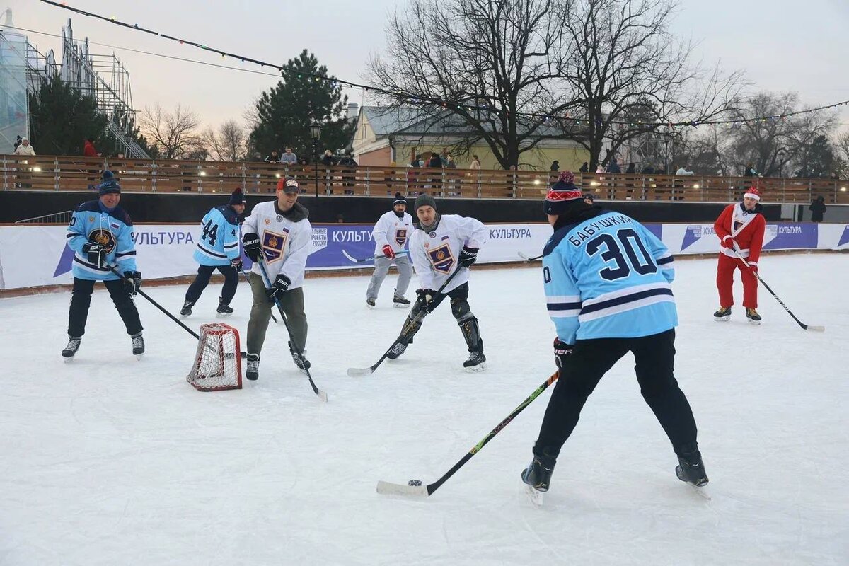 Сегодня утром губернатор провёл традиционный товарищеский хоккейный матч на открытом льду.