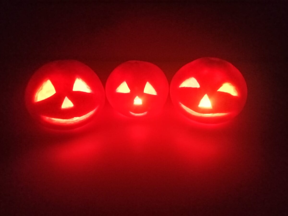 История из нашего дурдома дома. Гриша заинтересовался праздниками. Очень хотел отметить Хэллуин. Заболел. Все заболели. Но вдруг... В декабре он спросил, сколько дней до следующего Хэллоуина. Я сказала и спросила: а что? Ты хочешь его отмечать? Да, хочу. ОООООООООООО. А что ты хочешь? Гриша: - Тыквы с лицами. МММММ. Отправились в декабре в поход за тыквами. Миссия провалилась) Тыкв нет. Креатив в студию!!!!!!!!! Из чего же можно сделать тыквы???? В декабре. Ясное дело, папье маше, пластилин. Но первое делать долго. Второе не подойдёт, потому что Гриша туда хотел свечи запихать. Что же делать, что же делать?.. Что ещё похоже на тыквы? Правильно. Апельсины, мандарины и грейпфруты. Мандарины. Слишком мягкая кожура. Апельсины - маленькие. Грейпфрут - самое то. Три грейпфрута, ножницы, нож, вилка, ложка, фломастер. Тыквы готовы. И даже милые какие-то вышли. Итак. Если вдруг возникла необходимость очень быстро сваять "тыкву с лицом", можно и вот так. П.С. Делать надо именн