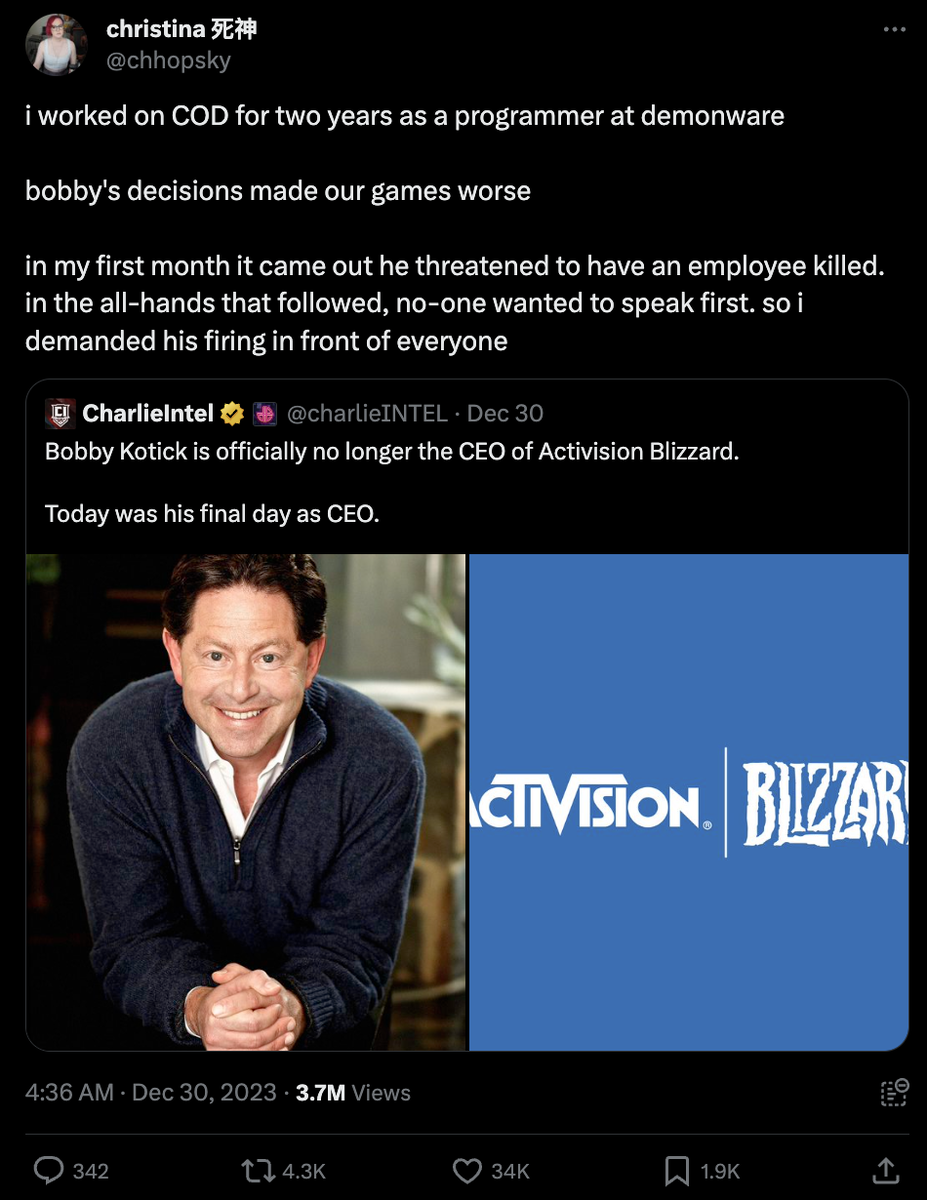 После 32 лет Бобби Котик больше не занимает кресло гендиректора Activision Blizzard. После памятного слияния видеоигровой компании с Microsoft Котик ушел в отставку в пятницу, 29 декабря. Менее чем через 24 часа после его ухода нынешние и бывшие сотрудники Activision Blizzard обратились к социальным сетям, чтобы поделиться заявлениями о том, что бывший гендиректор не прислушивался к их опасениям, угрожал сотрудникам и был плохим лидером. В X бывший программист Call of Duty в Demonware Кристина Поллок нарушила молчание после последнего дня Котика в должности гендиректора, утверждая, что игры серии FPS выходили "хуже" из-за его "решений". В первый месяц моей работы выяснилось, что он угрожал убить одного из сотрудников. На общем собрании, последовавшем за этим, никто не хотел говорить первым. Так что я потребовала его увольнения перед всеми... Нам всем нужно выступать против таких людей. Это заявление относится к ситуации, возникшей в 2006 году, когда Котик оставил голосовое сообщение с
