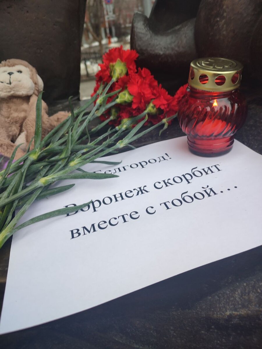 «Скорбим»: детские игрушки и цветы несут воронежцы к мемориалу в поддержку Белгорода