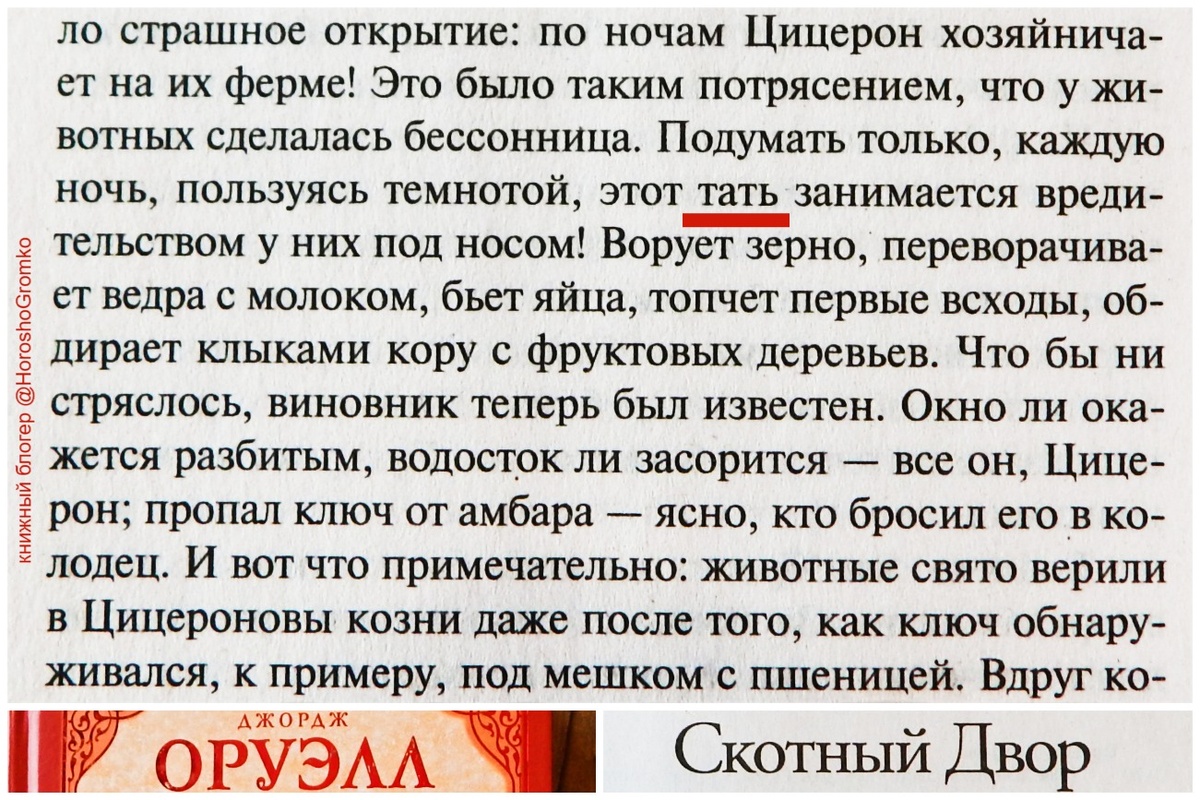 Сегодняшнее слово - тать - из антиутопии Джорджа Оруэлла «Скотный двор» в переводе С. Э. Таска. «Скотный двор» - басня о животных на скотном дворе, но на самом деле о событиях первой половины ХХ века в СССР. Однажды животные, вдохновлённые заветами мудрого хряка Майора, подняли восстание, свергли фермера и постановили, что отныне они все равны (потом оказалось, что некоторые равнее) и будут жить и работать не на людей-эксплуататоров, а на самих себя, будут строить анимализм. Когда Майор умер, руководить коллективом вызвались свиньи Наполеон и Цицерон. Вскоре Наполеон возжелал единолично править фермой, прогнал Цицерона, объявил его врагом и обвинил во всех бедах. Всё, что на ферме идёт не так, - это происки Цицерона, поэтому животные должны объединиться под предводительством Наполеона в борьбе с Цицероном и троцкистами его приспешниками, а кто недоволен, тот пособник врага и шпион. Вредил Цицерон на самом деле или нет - неизвестно, но пропаганда активно выставляла его источником всех