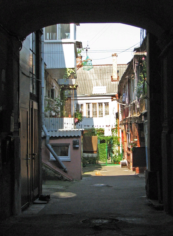 Одесский дворик ранним утром. Издалека со стороны порта слышны корабельные гудки, гул и стук подъёмных кранов. На крышах домов воркуют дикие голуби. Пахнет морем, акацией и подлым душком из мусорного бака, бельмом стоящего у входа во двор. С балкончика напротив раздаётся сонный голос: