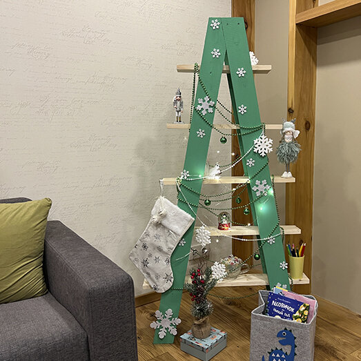 Время подходит к заветной сказочной полночи, куранты уже ловят кураж в преддверии заветного боя, но дома почему-то ещё не всё искрится новогодним настроением? Надо срочно это исправить! Вам понадобится: 1) Доска 20 х 96 мм; 2) Брусок декоративный 19 х 19 мм; 3) Пила или ножовка по дереву; 4) Уголок, рулетка, карандаш; 5) Саморезы; 6) Мебельные стяжки конфирматы; 7) Матовая акриловая эмаль зеленого цвета, кисти; 8) Ёлочные украшения. Этапы сборки: 1. Изготовьте из доски каркас высотой 1500 мм и шириной 700 мм; 2. Для соединения стенок нарежьте десять брусков длиной 100 мм; 3. При помощи мебельных стяжек закрепите их между стенками; 4. Соедините две половины стеллажа и покрасьте; 5. Подготовьте полки длиной 800, 700, 600, 500 и 400 мм. Расставьте их на стеллаже и закрепите их; 6. Расставьте на полках всё, что захотите, и не забудьте про новогодние другие украшения! Такой стеллаж станет отличным украшением интерьера и после новогодних праздников - ведь и ёлки стоят круглый год, а хранить