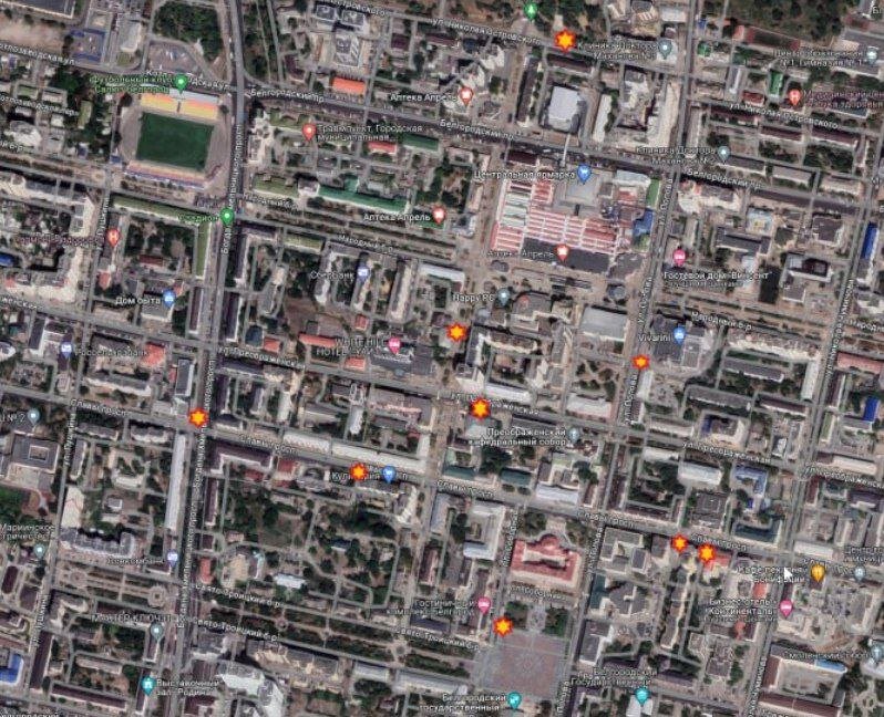 На карте хорошо видно, что залп РСЗО произведен не прицельно, а “примерно в центр города”. В результате – поражены достаточно случайные объекты в центре города, среди которых нет военных частей, предприятий промышленности и органов власти.