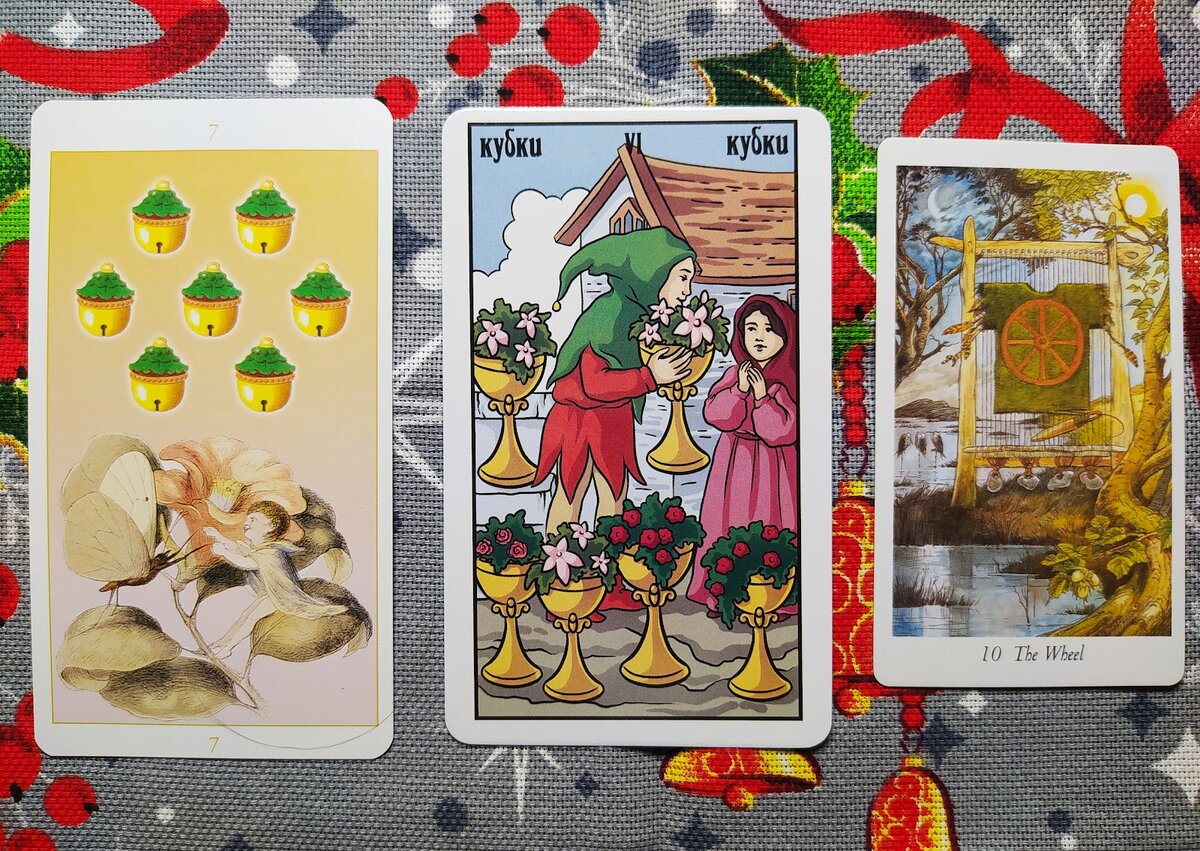 Здравствуйте, уважаемые мои читатели. Поздравляю вас с началом Нового прекрасного Года! И предлагаю вашему вниманию три метафорических карты, чтобы составить представление о событиях грядущего месяца. И так, что готовит нам Январь месяц? У нас выпало три карты, по одной из каждой колоды Таро. Это 7 Бубенчиков, 6 Кубков и 10 Старший Аркан - Колесо. На первой карте мы видим мальчугана, который сидит на листе цветка и общается с бабочкой. Улыбаясь, он протягивает к ней руки. Мотылёк отвечает взаимностью. Может быть, эти крохотные существа играют в ладушки. На другой карте юноша дарит девушке вазу с цветами. Тут мы опять видим взаимную симпатию. А вот третяя карта таинственна и загадочна. Здесь, помимо основного символа Колеса Судьбы, представлен разнообразный набор значимых элементов. Это и река, на берегу которой стоит ткацкая рама с не до конца сотканной на ней рубахой. Это небесные светила, деревья и три цапли. О чём говорят нам эти символы? Цветы олицетворяют радость, изобилие, красо
