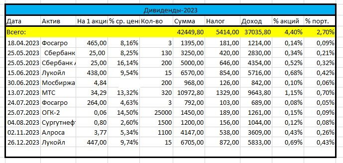 У меня в портфеле сейчас 16 разных акций. На протяжении года было 17. Но дивиденды в течение года выплачивались только по 9 из них. И еще по двум заявлены, но выплачены будут в начале 2024 года.