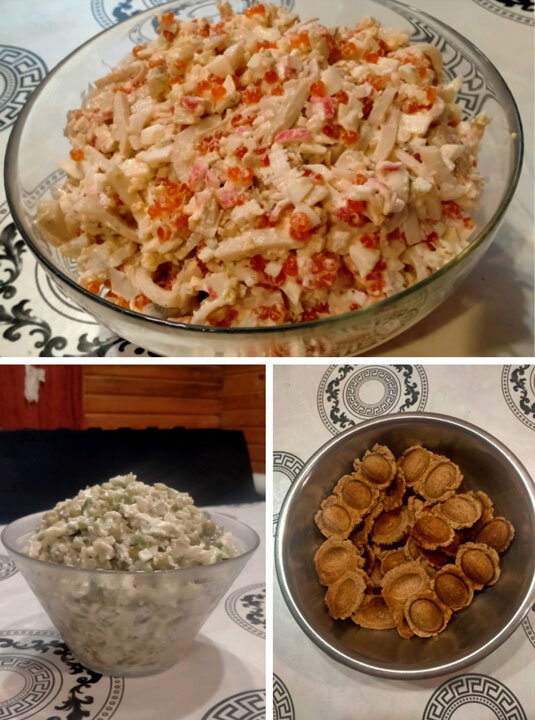 К празднику готовила отдельно салаты для себя. ► Оливье. У семьи - традиционный. У меня - «мой». ✔ Куриная грудка отварная; ✔ Яйца куриные; ✔ Огурцы маринованные; ✔ Авокадо; ✔ Горошек зелёный; ✔ Майонез (делала сама). ► Салат с кальмарами. Отварила кальмары, треску. Мелко нарезала. Измельчила несколько крабовых палочек. Красная икра в этот раз имитированная, увы... Там, где брали обычно, не было. Чем где-либо купить задорого непонятную подделку, лучше уж взять в магазине честную фабричную имитацию за земные деньги. Яичные белки нарезала, а желтки растерла с майонезом и заправила салат. ► Вместо тарталеток ещё вчера испекла «орешки» в электрической «орешнице». Быстро и удобно. Получаются плотные и не размокают. В половинки положила сливочный сыр с зеленью. Тесто для «орешков»: ✔ Масло сливочное – 200 г; ✔ Мука овсяная+ кокосовая - 2,5 стакана; ✔ Мука цельнозерновая - 0,5 стакана; ✔ Яйца – 2 шт.; ✔ Соль, разрыхлитель – по 0,5 ч.л. Масло натираю на тёрке и перетираю с мукой, добавляю яйца