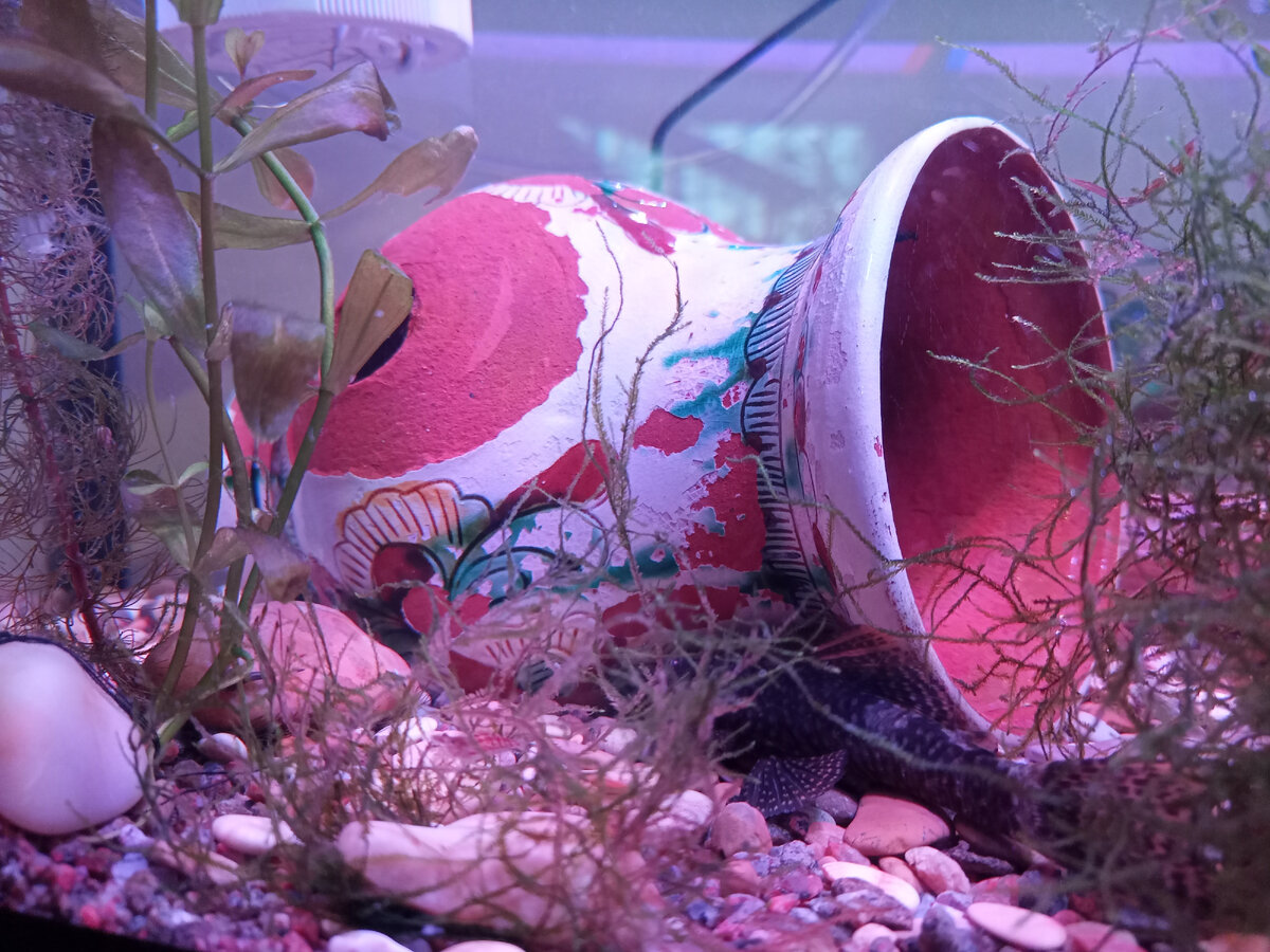 На дно я положила старый керамический кувшин без ручки, мне казалось, что сомам будет самое оно прятаться, и чашку с отбитым краем. Предварительно я это все прокипятила, кстати.