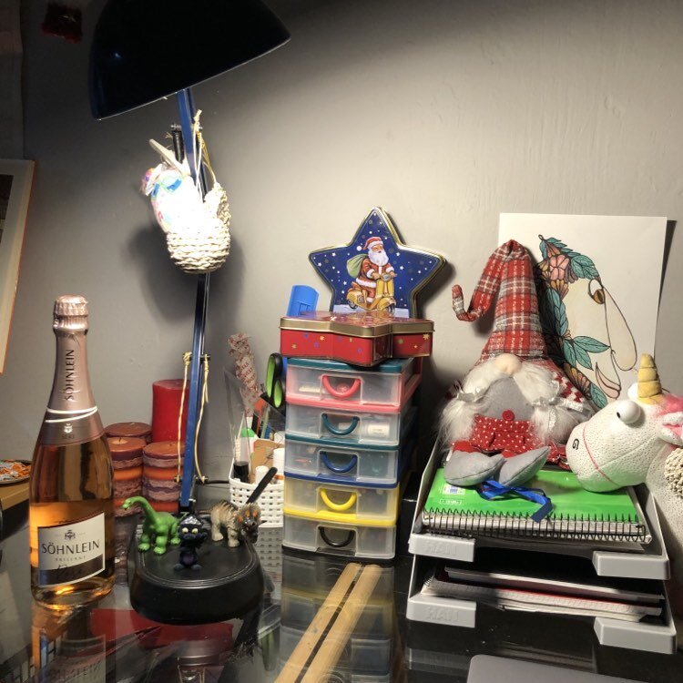 Друзья, доброе утро в новом году! Помню, что вам любопытно посмотреть, как я обустроилась в сквоте. Сегодня нашла настроение, чтобы показать святое святых - свой рабочий стол. Но он такой большой, что весь в кадр не поместился - будет три кадра ( три поста) Разглядывайте, оставляйте свои впечатления в комментах. На фото: левое крыло - совсем, как в самолёте, поэтому пристегнитесь, чтобы не укачало. На левом крыле: Солидная немецкая настольная лампа. Кажется, такие были в сериале "Семнадцать мгновений весны" На ножке лампы живут Дракончики: два ( зелёный и коричневый) - Дэн и Нис из музея Природы и ещё один Драко Чёрный - его подобрали с Дэни на улице. Так что на улице я подбираю не только людей, но и всех, кто мне понравится. На лампе висит Мягкий, яйцеобразный котик в шляпке ( его плохо видно, но он милашка). Нечаянная находка Дани. И ёлочный шарик из джутовой верёвки, сделанный моими прекрасными ручками. Четыре красные свечи ручной работы - также находка Дани. Я их зажигаю по вече