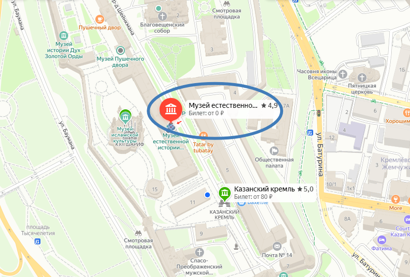 Музей естественной истории Кремля находится на территории Казанского Кремля в длинном белом здании формой буквы П (вход со стороны проезда Шейкмана).