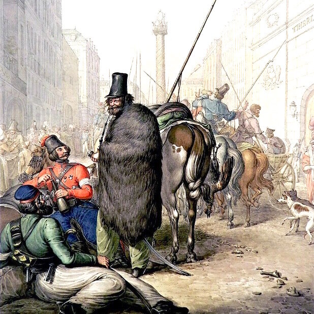 В полдень 31 марта 1814 года кавалерия во главе с царем Александром I триумфально вступила в Париж. Это событие положило конец наполеоновским войнам и ознаменовало победу России в борьбе с французским агрессором. Шахматный ход Наполеон, рассчитывая на несговорчивость союзников, не ожидал наступления на Париж. Союзники же, воспользовавшись численным преимуществом, смогли быстро разгромить французские войска и занять столицу Франции. Всем Парижем Парижане боялись мести русских, которые в их представлении были жестокими и варварскими. Однако поведение русских солдат и офицеров оказалось гораздо более миролюбивым, чем ожидали французы. Страшные прогнозы Молодые офицеры были приняты в аристократических кругах Парижа, в том числе и у известной гадалки мадам Ленорман. Она предсказала одному из них, Сергею Муравьеву-Апостолу, что его повесят. Это предсказание оказалось пророческим: Муравьев-Апостол был казнен за участие в декабрьском восстании. Казаки в Париже Казаки, которые составляли значи