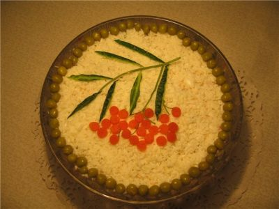 Для приготовления салата мне понадобились упаковка крабовых палочек (200 г), 2 яйца, 1 морковка отварная (75 г), огурец (160 г - без кожицы), 3/4 стакана риса (115 г), зеленый горошек (110 г), майонез (100 г) Тем временем рис сварился. Промыла его, добавила в миску с порезанными овощами и крабовыми палочками, перемешала, добавила горошек и майонез и еще раз хорошо перемешала. Выложила в салатницу, Разровняла. Сверху выложила натертые на мелкой терке яичные белки - "снег". Выровняла белки, немножечко прижала ложкой, чтобы поверхность была ровной. Из кожуры огурца вырезала "рябиновые листочки", маленькой выемкой из кружочков морковки вырезала "ягоды"