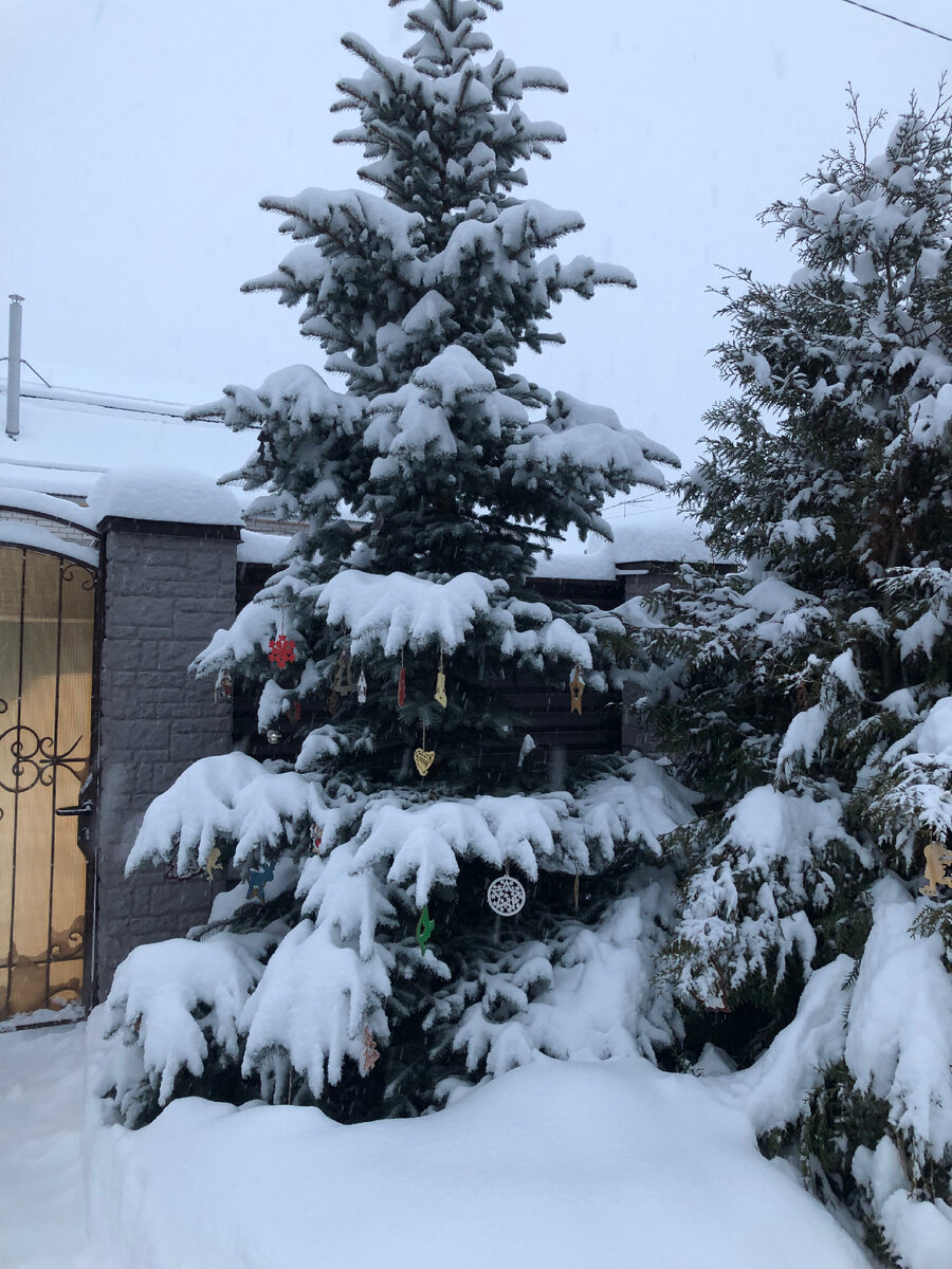 Дворик мы украсили к приезду детей. Ёлочки занесло снегом, потом все расстаяло, и игрушки снова было видно.