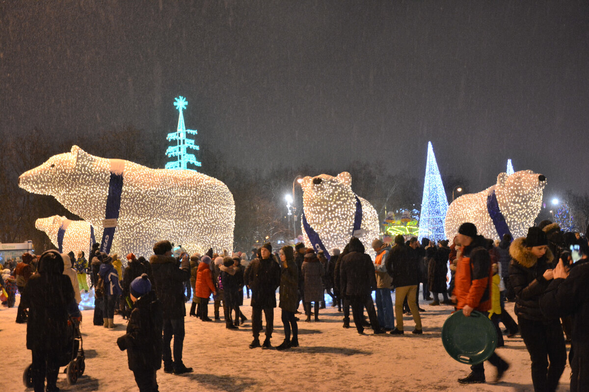 Медведи в Тюмени. Их даже три. Они электронные – этакая новогодняя бутафория. Народу, как видите на фото, нравится. Мишки – они же добрые, шибко умные. Знатоки утверждают: хищники весьма опасны. Говорят, что белые медведи при встрече растерзают человека стопудово. Бурые – дают шанс, короче, 50 на 50 процентов.