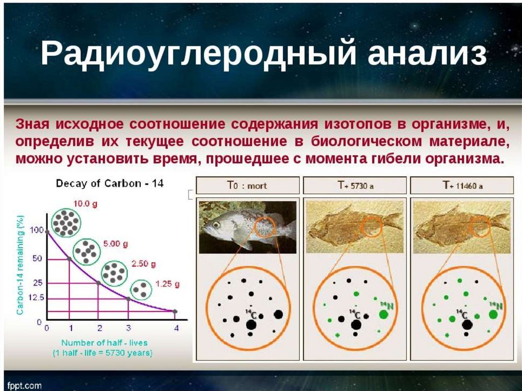 Радиоуглеродный анализ и датирование образцов органики основан на получении информации о концентрации радиоизотопа углерод-14 (С14), который растения и деревья вбирают в себя за время жизни из атмосферы. Изотоп С14 имеет период полураспада 5700 лет ± 3 года. Причем, в первых опытах получали значения 2700 и 4000 лет, затем была принята цифра 5568 ± 30 лет.