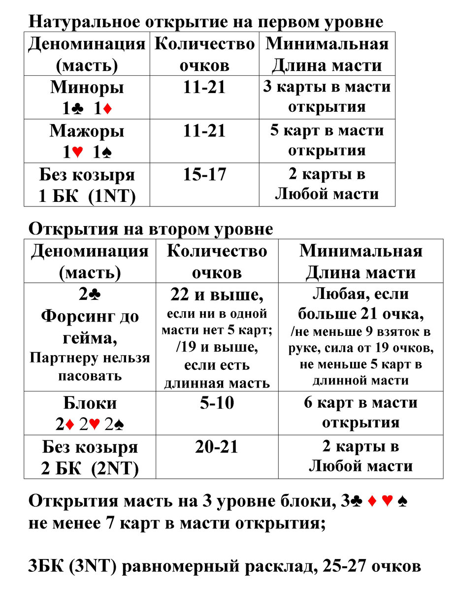 Таблица открытий Первый ответ на открытие партнера Ответ на открытие в миноре Аналогичные ответы на открытие 1 бубна. Ответ на открытие в мажоре Аналогичные ответы на открытие 1 пика. Ответ на открытие 1 без козыря Ответ 2♣ на 1 БК поиск фита в мажоре (Стейман), при силе 8 или больше очков, есть 4 карты в одном или обоих мажорах. Ответ открывшего 1БК на 2♣ 2♦ означает Партнер, у меня нет четырех (или пяти) карт ни червы, ни пики : 2♥ Партнер, У меня четыре (или пять) червей: 2♠ Партнер, У меня четыре (или пять) пик. Ответ на 1БК другой мастью это трансфер Якоби, просьба назвать масть следующую по старшинству, ответ 2БК инвит, если нет мажоров, а очков 8-9. Ответы на 2 БК аналогичные, но на уровень выше, Стейман при силе от 4 очков. Ответ на открытие 2♣ Отвечающий не может пасовать, иначе 2♣ станет окончательным контрактом. Отвечающий может предложить любую масть, если его рука соответствует всем этим требованиям: Сила не менее 8+ очков, Есть 5+ карт этой масти и есть минимум две из тре
