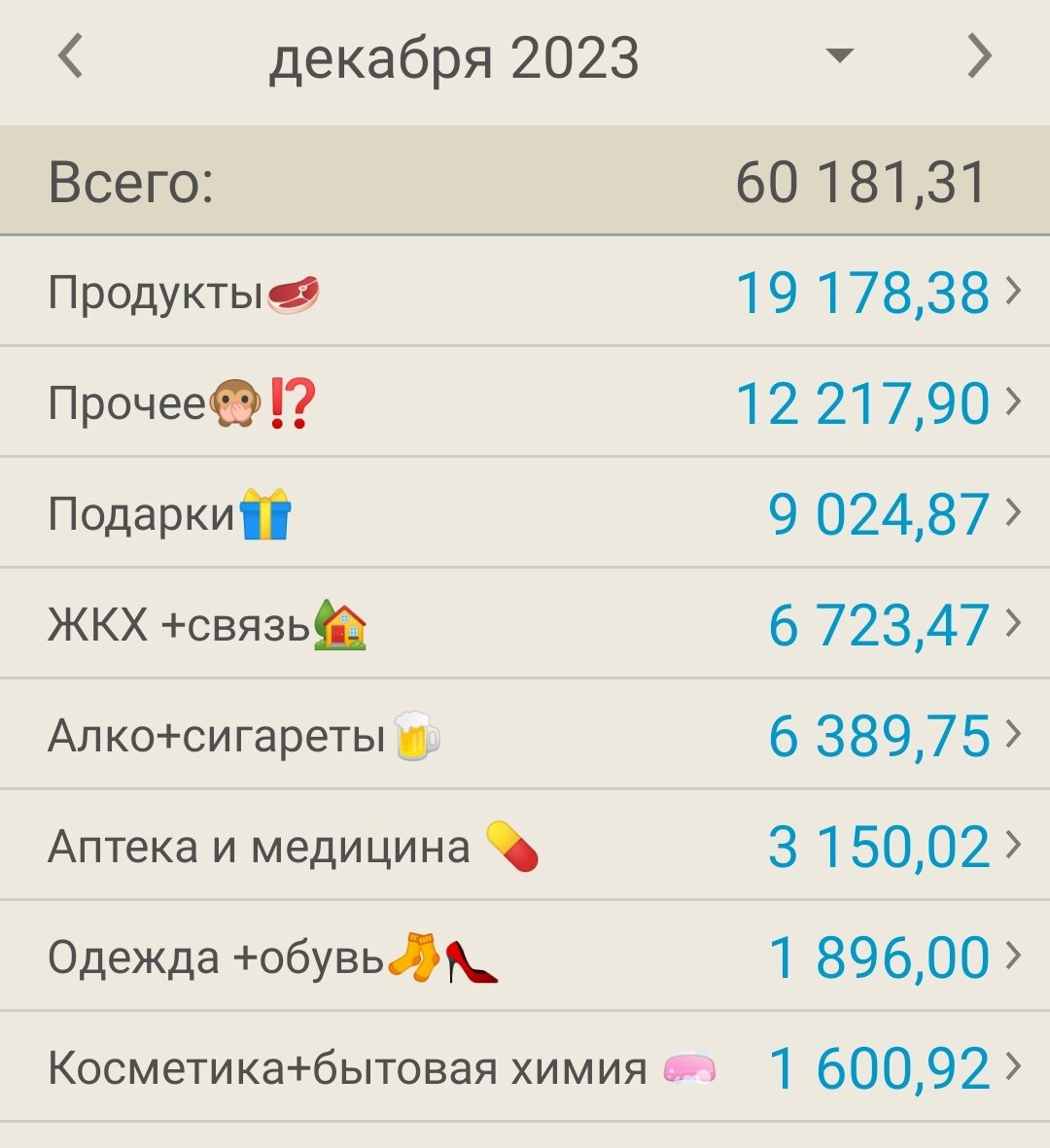 Ну что, январь месяц наступил, можно и подвести финансовые итоги декабря. Всем привет, вы на канале Дневник экономного дома и тут я рассказываю об экономии, накоплении и минимализме🎄 О других месяцах можно почитать тут: Познакомиться со мной тут: Декабрь был затратный ввиду приближающегося праздника🎄☃️Расходы составили 60.181,31 руб. Больше чем планировалось. Доход же в свою очередь составил 133.580, 58 руб. Тут выплачена зарплата за декабрь в декабре, заранее. И мне и мужу. ⭐ЗП я - 79090,45. Тут ещё премия. ⭐ЗП муж - 51000,00 руб. ⭐% по вкладам - 1962, 13 руб. ⭐Прочее-891,00 (за сканирование) ⭐Авито - 637 руб. Итак по расходам: 1.на продукты ушло 19 178,38 руб. Да, многовато, тут закупка к новогоднему столу, доставка пиццы и суши, и тем не менее сумма большая, думаю тут играет роль рост цен. 2.Подарки - 9024, 87 руб. Тут подарки к новому году, 1 день рождение и на работе скидывались коллеге на юбилей. 3.Прочее - 12217,90. Покупка вертикального пылесоса, салют