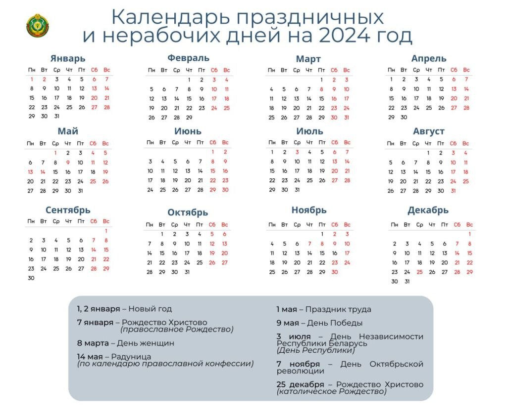 Постановлением Совета Министров Республики Беларусь от 23 ноября 2023 года № 814 утверждены переносы рабочих дней в 2024 году. В соответствии с постановлением рабочие дни в 2024 году переносятся: 13 мая (понедельник) на 18 мая (суббота). Днями отдыха в мае 2024 года будут 11 (суббота), 12 (воскресенье), 13 (понедельник) и 14 (вторник) – 4 дня 8 ноября (пятница) на 16 ноября (суббота). Днями отдыха в ноябре 2024 года будут 7 (четверг), 8 (пятница), 9 (суббота) и 10 (воскресенье) – 4 дня. Переносы рабочих дней распространяются только на тех, кто работает в режиме пятидневной рабочей недели с выходными днями в субботу и воскресенье.