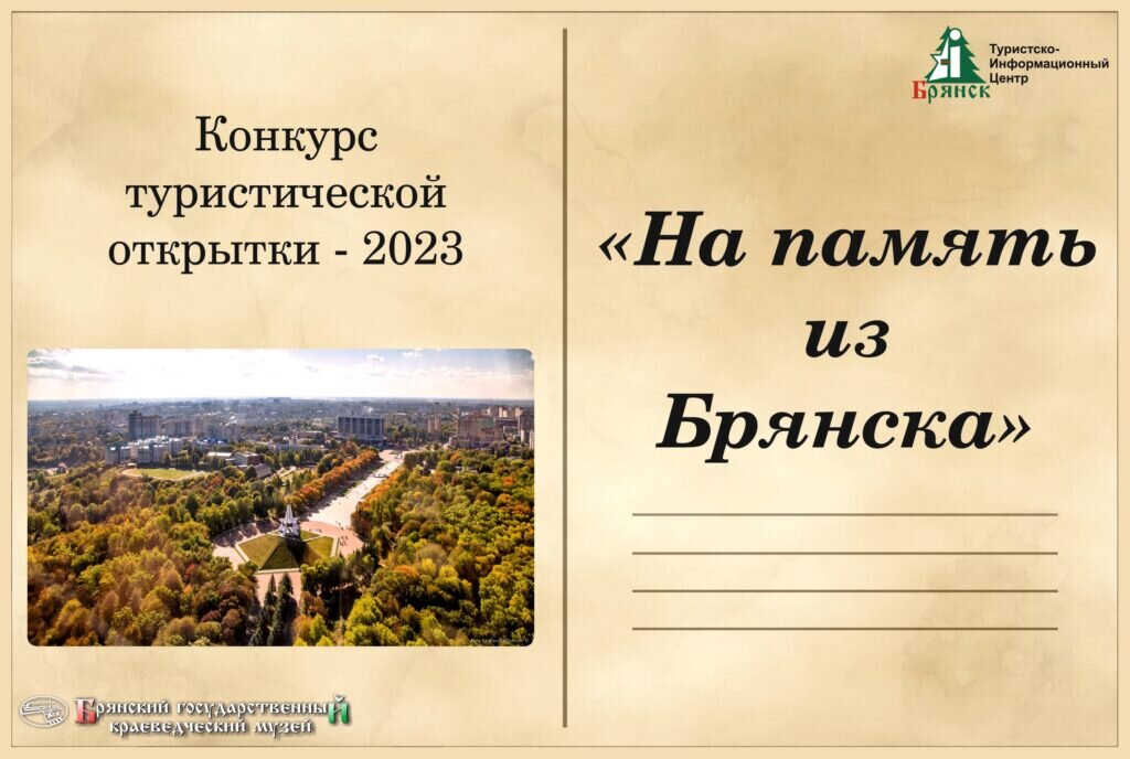 В целях разработки информационного обеспечения туризма Брянской области, жителей региона приглашаю поучаствовать в конкурсе туристической открытки «На память из Брянска». Конкурс способствует: — формированию у жителей области активной жизненной позиции, предоставляют возможность участвовать в общественной жизни своего региона, своей малой Родины;