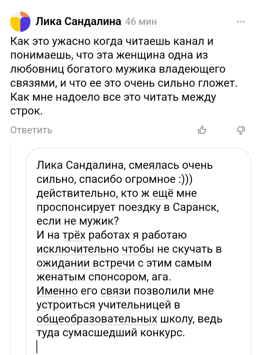 Автора этого канала содержит женатый спонсор! Именно такой комментарий оставили под статьей про итоги моего 2023 года. Этот странный комментарий побудил меня вспомнить самые странные комментарии под статьями за 2023 год. 1. ⬇️ Автор данного комментария очень хорошо разбирается в русском языке и учит этому меня. 2.⬇️ Эту барышню просто разрывает на сотню Марусек, когда она смотрит фотографии чужой еды в интернете. 3.⬇️ А вот эта дама - гибрид первой и второй. И русский язык хорошо знает, и от интернет-фото чужой еды ее буквально рвет. 4.⬇️ Дама сначала все внимательно прочла, а потом спрашивает, родимая, для кого и зачем это написано. Л-логика. 5.⬇️ Слово "помидорка" Ульяна Малахова требует запретить к написанию в интернете. Видимо, что-то личное. 6.⬇️ Оказывается, в ресторанах не должны предупреждать, что пельмени принесут зелёные вместо обычных. Хочешь, чтобы предупреждали о синих котлетах или фиолетовом кофе - ты яжемать. Не спрашивайте, почему, я не знаю. Но куда страннее, что 3