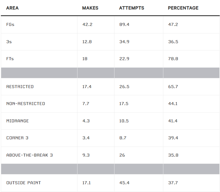 Взгляните на средние показатели и процентное соотношение всех бросков по Лиге. Общее количество бросков (FG), трёхочковые (3s) и штрафные (FTs) броски имеют точное значение, в то время как разбивка по зонам имеет приблизительный характер взятый с NBA Advanced Stats.