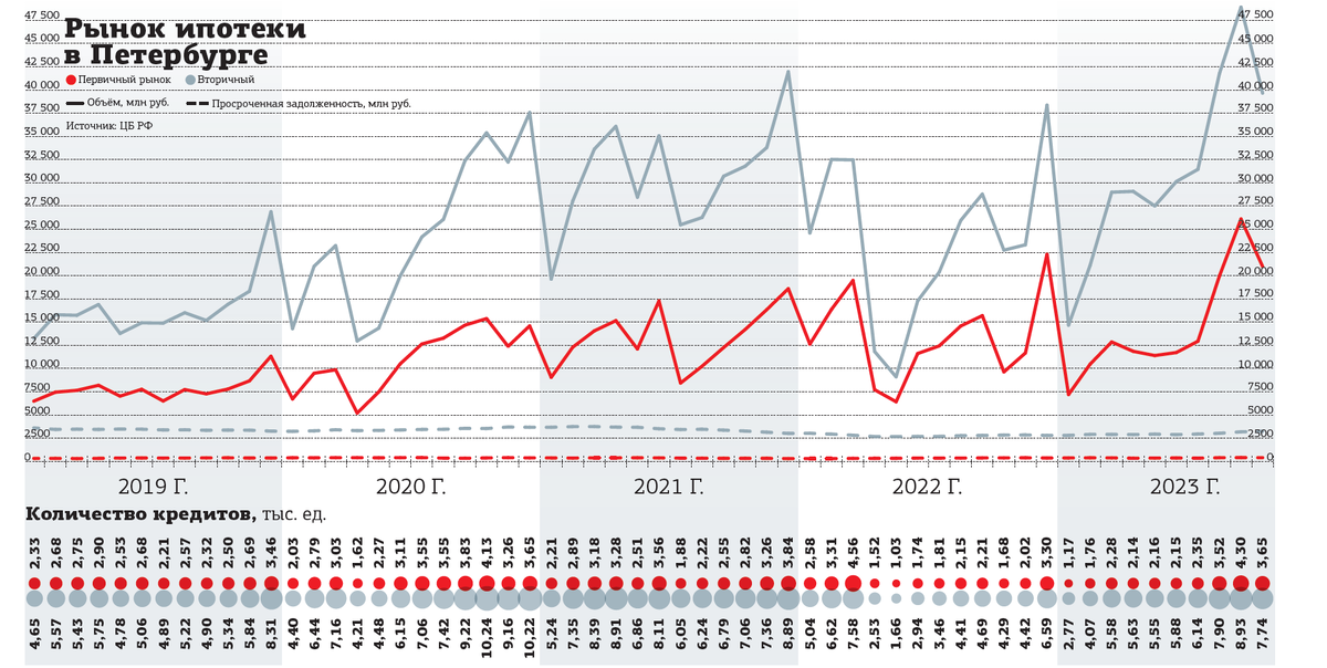 Примерно 40% текущих выдач ипотеки стало приходиться на заёмщиков с показателем ПДН 80% и выше (предельная долговая нагрузка, рассчитывается как соотношение доходов к расходам на обслуживание кредитов). Доля кредитов с первоначальным взносом до 20% (который в теории и является страховым буфером при снижении цены) на первичном рынке достигает 63%, на вторичном — 44%.