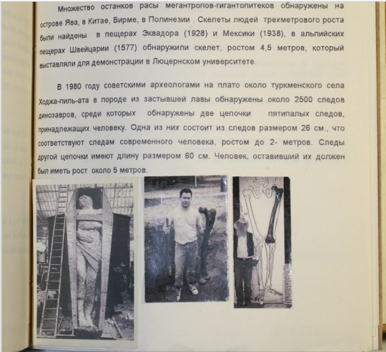 Археологические исследования, как сообщается в докладе, проводимые по всему миру в течение 150 лет, совершенно опровергают теорию Дарвина. Напомню, что в начале доклада рассказывалась история развития человечества на основе теософских взглядов, и говорилось о том, что на Земле до нашей пятой расы было еще четыре. Рост людей предыдущих рас был несколько выше обычного роста современного человека, но никто не верит в то, что прежние цивилизации имели больший рост. Однако, по материалам данного доклада, в результате археологических раскопок были найдены кости и фрагменты довольно больших существ.