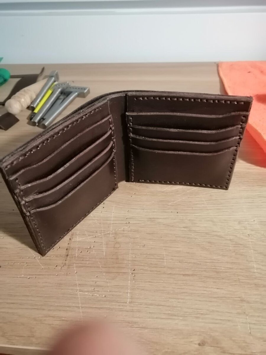 Сейчас покажу, что уже успел сделать, понимаю и вижу ошибку и недочёты в своих изделиях, но на то я и учусь. Не делает ошибок только тот, кто ничего не делает. Вот такой вот кошелёк был моей первой работой. Правда кожу выбрал толстую и он оказался достаточно объёмным. Потом сделал вот такой футляр для пачки и зажигалки. Курение вредит здоровью. Моё третье творение это сумка через плечо. Достаточно удобная, мне понравилась. Буду делать ещё одну сумку, но с большим объёмом и сделаю длиннее ремень. Перчатки мне понравилась, ездил в них за рулём в поездке на 1500 км. Ну и сейчас в процессе создания вот такого рюкзака, короткое видео с ним есть на канале.