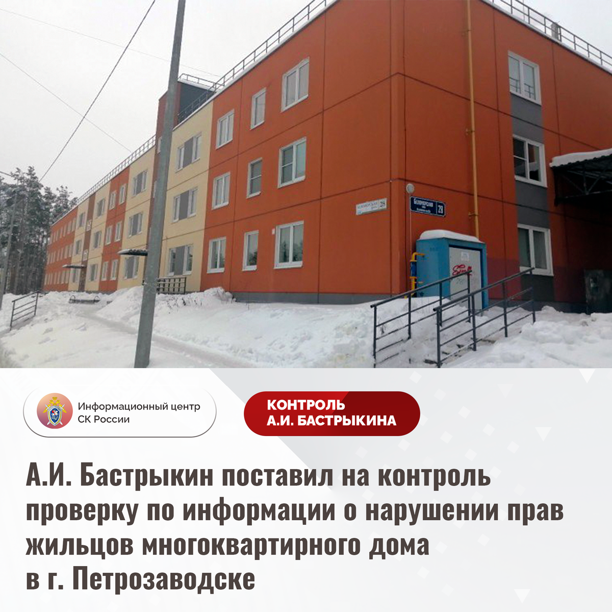 В СМИ и социальной сети сообщается о нарушении прав жильцов многоквартирного дома по улице Беломорской в городе Петрозаводске Республики Карелия. В 2017 году жилые помещения в новостройке предоставлены 84 семьям, переселенным из аварийного жилья. Однако этот дом находится в ненадлежащем состоянии: за короткий период времени на стенах и потолке появились плесень и грибок, фундамент покрылся трещинами, отопление и водоснабжение не соответствуют установленным нормативам, имеется угроза выхода из строя котельной. Неоднократные обращения граждан в обслуживающую организацию и администрацию результатов не принесли.
