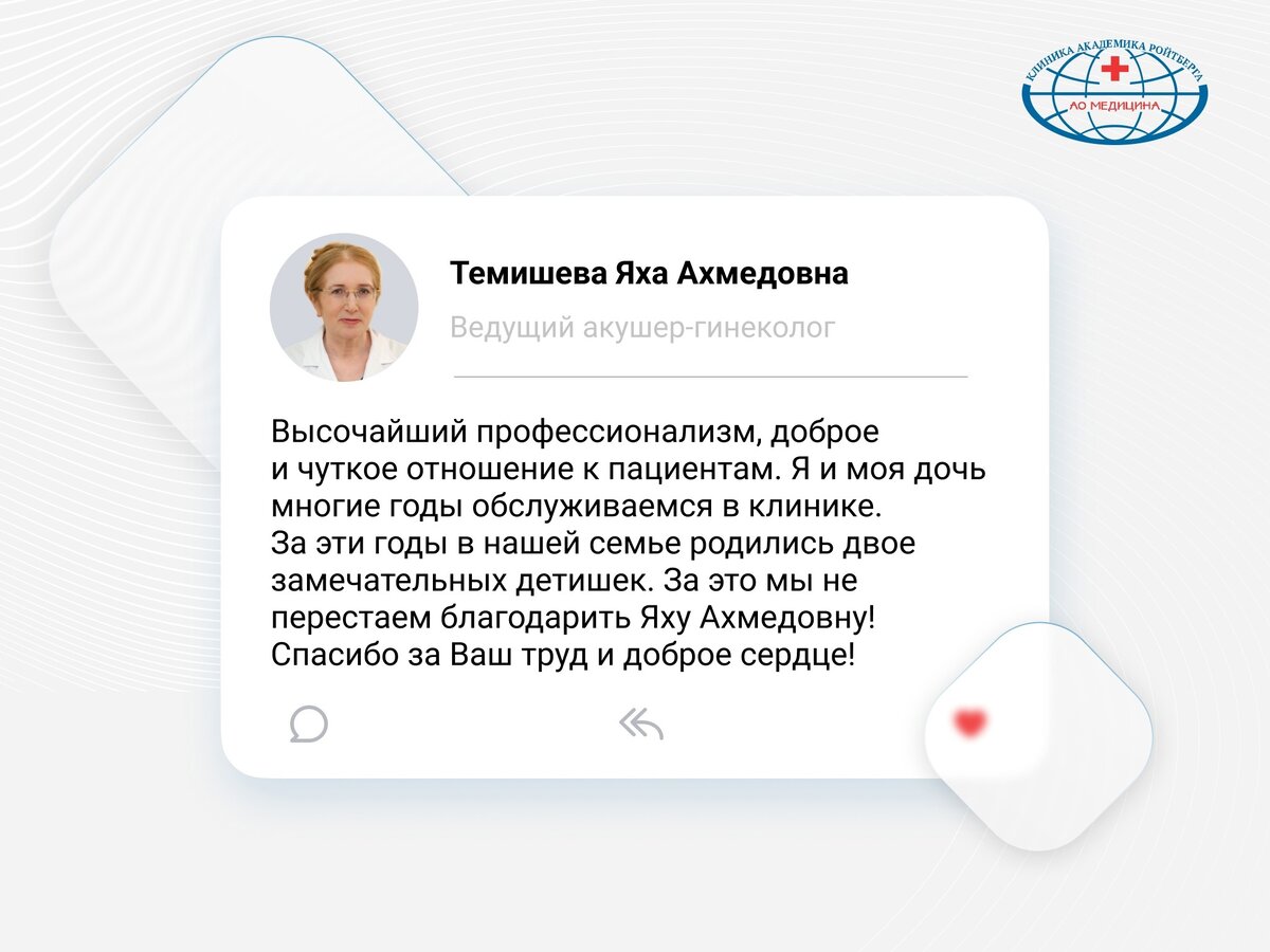 Темишева Яха Ахмедовна — акушер-гинеколог высшей категории, к.м.н., член российских и европейских ассоциаций гинекологии, репродуктивной медицины и хирургии. Стаж — 46 лет.