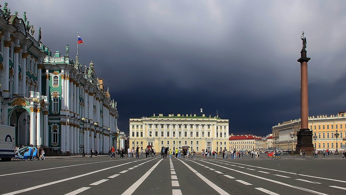 С одной стороны площади возвышается Зимний дворец, созданный мастером Б. Ф. Растрелли в стиле елизаветинского барокко. Это здание украшено изящными деталями и богатым декором, приковывающим взгляды своей роскошью. С другой стороны площади нас встречает здание Главного штаба, прекрасный образец величественного ампира, придуманного архитектором К. Росси.