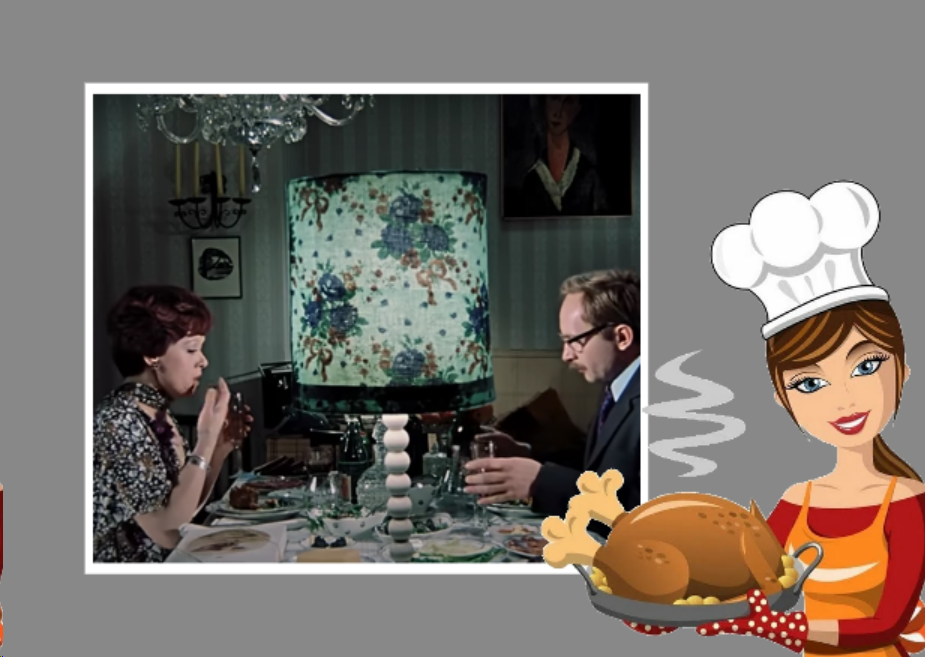 Сегодня предлагаю оценить кулинарные способности товарища Калугиной. Какие же блюда она наготовила, желая угодить Анатолию? Итак, приступим к изучению вкусных деталей комедии. Первая треть второй серии. Анатолий торопливо шагает в гости с коробочкой шоколадных конфет ("Ассорти шоколадное" - это были весьма недорогие конфеты, чем подчеркнули доходы героя), Людмила в это же время бегает с кухни в комнату, где накрывает стол. Сначала можно заметить хрустальную вазу с краснобокими яблочками и аппетитными апельсинами - почти как на Новый год, женщина явно хотела добиться праздничного настроения. Кстати, на кухне у Людмилы можно заметить еще одну такую же фруктовницу - видимо хозяйка думала, что Анатолий окажется падок на фрукты. Следующий кадр - нам показывают, как Людмила приносит с кухни колбасные нарезки. Это еще один атрибут праздничного стола - практически каждая советская хозяйка считала своим долгом поставить перед гостями тарелку с тонкими ломтиками колбасы. Интересно, что Людмила