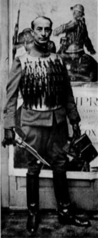 Иногда остаётся только удивляться, насколько необычным и поразительным может оказаться полёт фантазии оружейника. На этих старых фотографиях изображён знаменитый коллекционер антиквариата и оружия Чарльз Ной Дэйли в одной из своих самых необычных покупок. Данную кирасу обнаружили во французском Бордо в 1917 году и впоследствии оказалась в коллекции Чарльза Ноя Дейли, за что ему пришлось выложить приличную сумму. И хорошо, что вес панциря ограничился 30 фунтами (примерно 13 кг), ведь на стальной пластине ещё прикрепили однозарядные пистолеты в количестве аж девятнадцати штук. Когда стволы располагаются на теле под правильным углом, их можно использовать для стрельбы. Стреляла эта стрелковая система залпами по четыре или пять выстрелов за раз, для чего необходимо было нажать на спусковой крючок, также закреплённый на броне. Курок взводился с помощью ключа, который надо было носить на цепочке.