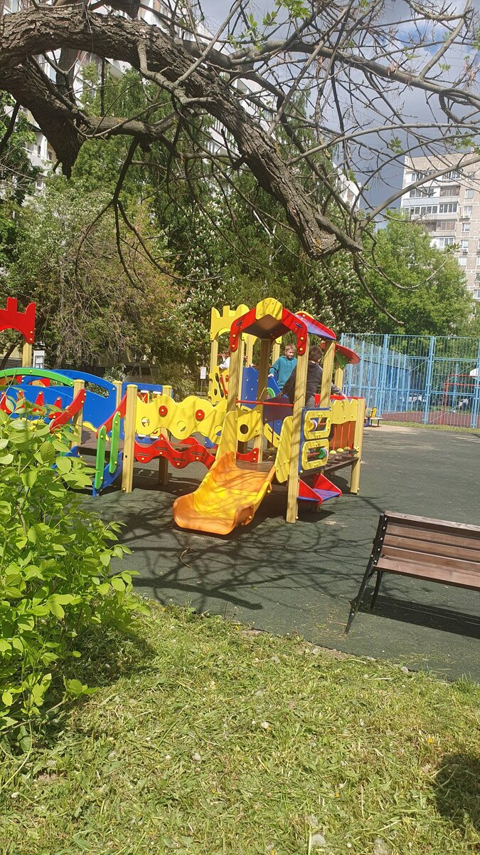 Атмосфера, в целом, обычная. Несколько родителей сидят по разным лавочкам, уткнувшись в телефон.