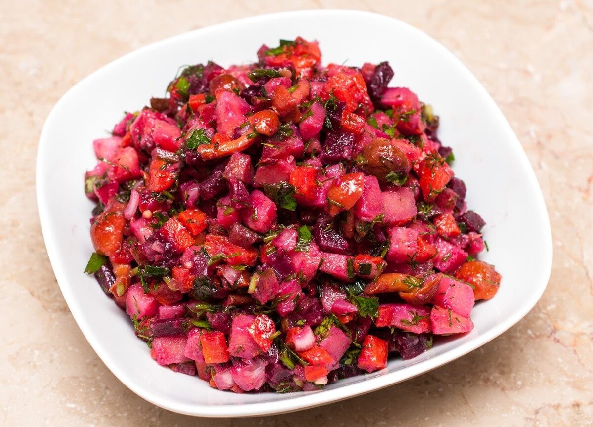 Винегрет является популярным среди россиян салатом, причем в наши дни существует множество вариаций этого блюда, где одни ингредиенты заменяются другими. Я вам предлагаю приготовить винегрет из запеченных овощей – так сохраняется большая часть витаминов. Пошаговый рецепт с фотографиями также был опубликован на сайте "Чемпионат". Предпочтение стоит отдать свекле среднего размера, так как крупный овощ является кормовым и не таким насыщенным Не менее важно соблюсти пропорции: свекла и картофель должны выйти примерно одним весом, морковь – на ¼ меньше, а лук – в 2 раза. Например, вы готовите винегрет из 1 кг картофеля и 1 кг свеклы, в таком случае моркови вы используете 750 гр., а лука – 500. Конечно, строго до грамма высчитывать не нужно, но, примерно соблюдая пропорции, вы получите красивый салат, где гармонично сочетаются все ингредиенты. Ингредиенты: Шаг 1 Свеклу, морковь и картофель тщательно вымыть. Каждый корнеплод отдельно завернуть в фольгу, предварительно добавив соль, масло, пол