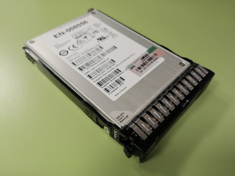 SSD диск корпоративного класса SAS HPE объём 3.84TB форм-фактор 2.5", модель DOPM3840S5XNNMRI. Судя по прошивке предназначается для СХД 3PAR, однако шёл с салазками для серверов HPE Proliant Gen8, Gen9, Gen10. Прекрасно определился в сервере и заработал. Воздержитесь от покупки! Смотрю на диск, странный он какой-то. Номер Spare P37074 подразумевает смешанную нагрузку, это DWPD в районе тройки. Однако, спецификацию именно на этот диск найти нереально. Единственное что нашёл, это характеристики Optimus MAX 4TB SAS SSD от SanDisk с тем же Part Number. При этом там надёжность DWPD 0.5. Даже если взять во внимание уменьшение общего объёма с 4 ТБ до 3.84 ТБ, DWPD вырастет незначительно. Да и прошивка от 3PAR смущает. И номер прошивки 3P01, эта древность ещё во времена HP была. Кажется, нам какое-то старьё слили. И интерфейс в Интернете гуляет от 6 Gbps до 12 Gbps. Жалко, не отодрал наклейку, чтобы год посмотреть. Проверил в iLO: скорость интерфейса 6 Gbps. Прошивка поновее, 3P07, явно диск п