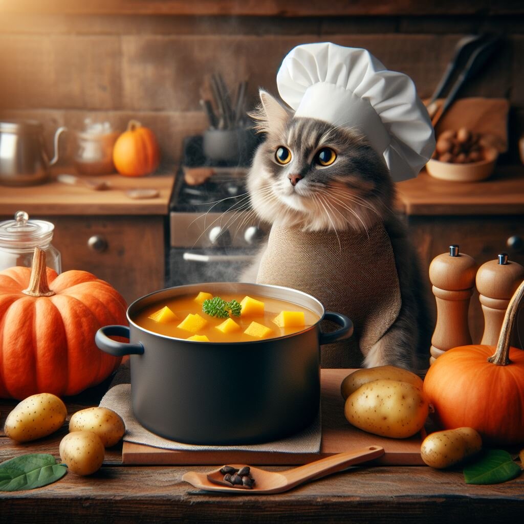 Суп-пюре из тыквы и картофеля - это нежный и ароматный суп, который подойдет для обеда или ужина. Он содержит много витаминов, минералов и клетчатки, которые полезны для здоровья. А еще этот суп очень нравится нашему котику Барсику, который всегда просит добавки. Для приготовления супа нам понадобятся следующие ингредиенты: - 500 г тыквы - 300 г картофеля - 1 луковица - 2 зубчика чеснока - 1 л куриного бульона - 100 мл сливок - 2 столовые ложки сливочного масла - соль, перец, мускатный орех, зелень по вкусу Способ приготовления: 1. Очистите тыкву от кожуры и семян и нарежьте ее кубиками. Ополосните картофель, почистите его и нарежьте также кубиками. Очистите лук и чеснок и мелко нарежьте их. 2. В большом кастрюле растопите сливочное масло и обжарьте на нем лук и чеснок до мягкости, помешивая, около 10 минут. Добавьте тыкву и картофель и продолжайте жарить еще 5 минут, помешивая. 3. Залейте овощи куриным бульоном и доведите до кипения. Снизьте огонь и варите суп под крышкой до гот