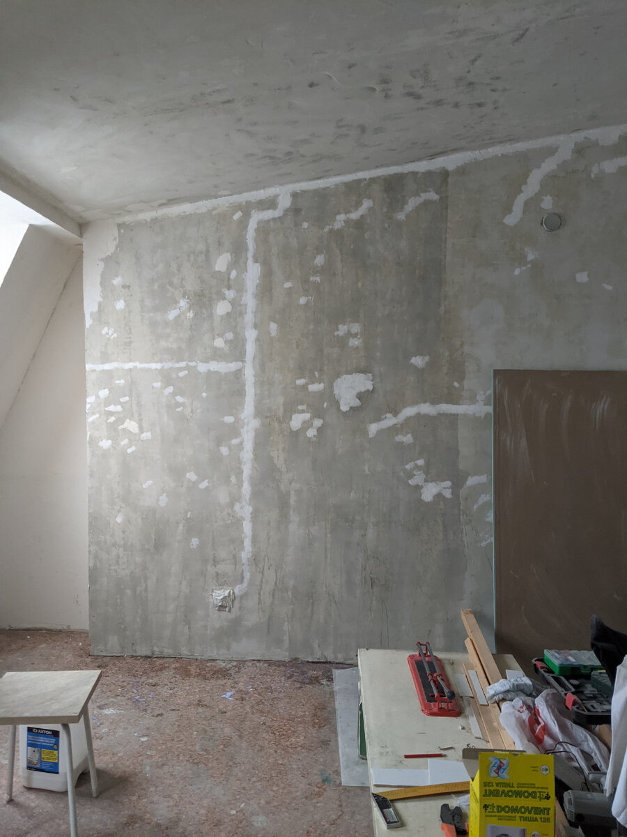 Новогодние праздники пролетают очень быстро. И не важно как вы их проводите: лежа на диване, катаясь на лыжах или ремонтируя квартиру. Вот и у нас остался последний выходной день. Грустно, но это не повод останавливаться. Итак, грунтуем стену в спальне. После высыхания грунтовки можно шпатлевать. По мере высыхания финишной шпатлевки стена приобретает ровный молочный цвет. Кроме некоторых особо подозрительных мест (на тот момент мы считали, что это последствия действий пожарных, после тушения возгорания в 2018 году). Пока я шпатлюю, муж решил пройтись затиркой по швам всей уложенной плитки. Затирка швов или по-другому фугование плитки - это обязательный процесс после того, как плитка была посажена на цементный клей, для обеспечения эстетичного внешнего вида плитки и для гидроизоляции швов. Затирку мы взяли недорогую, цементную. Бывает ещё эпоксидная, она считается долговечнее и качественнее. Но стоит в три раза дороже. Ведёрка сухой смеси фуги должно было хватить на стены в ванной и кух