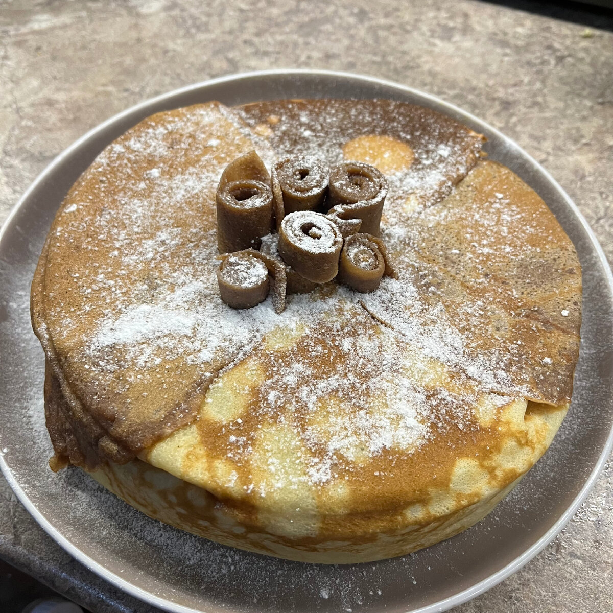 - Достаем торт из кольца, я переворачиваю его на тарелку нижней стороной вверх, и по желанию украшаем блинными трубочками, если есть -то ягодами, сахарной пудрой и можно подавать к столу.