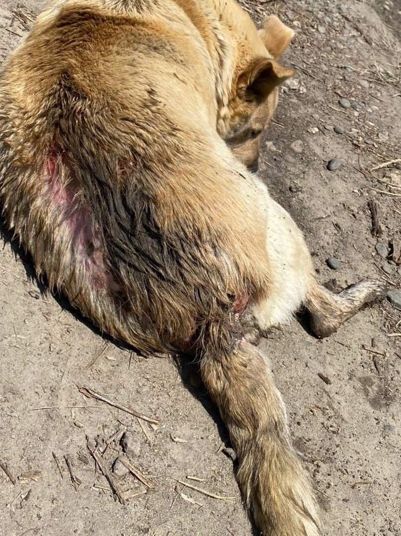 Собаку с обширными повреждениями кожи и не наступающую на заднюю лапу увидели на Мамайке. Попросили в соцсетях помощи отвезти несчастное животное в Ветцентр. На спине у собаки живого места не было, одна сплошная рана, инфицированная, с прилипшей травой и грязью. Плюс к этим травмам сильнейший мастит и общая слабость. В клинике сделали рентген и УЗИ. Переломов нет, на лапе кости целые, хромает из-за глубокой раны , которая гноится. Рана на спине непонятной этиологии, но неглубокая.