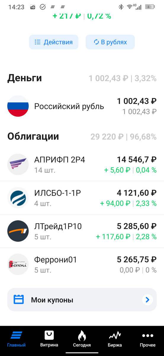 Добрый день. Сегодня купила ещё несколько облигаций. По двум предыдущим стабильно получала выплаты. На сегодня вложено 30000 рублей. Пассивный доход от облигаций составляет чуть больше 500 рублей в месяц. Это немного, но и лучше, чем ничего 🙃 Подпишись, чтобы не потерять 😉 Буду рада полезным советам и любым комментариям! Благодарю за уделённое время этой статье! 🤗