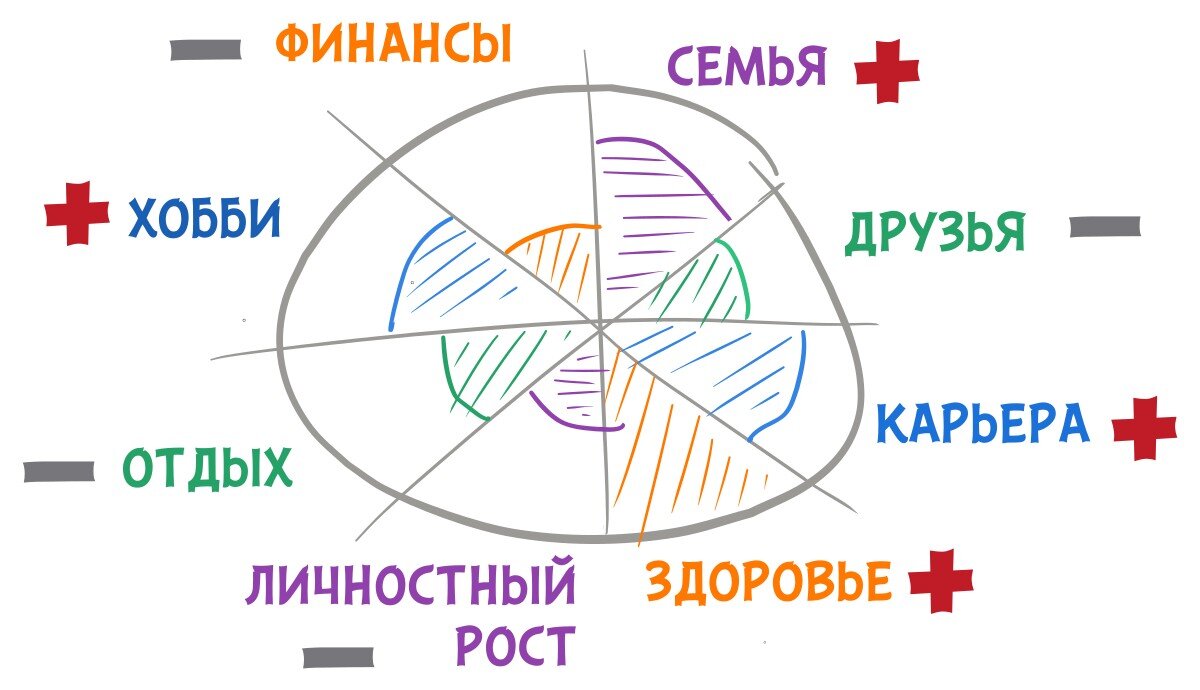 Вы скорее всего знаете о «Колесе жизненного баланса». Со счастьем можно сделать аналогичное «колесо» и посмотреть, в каком контексте вы уже счастливы (то есть важные ценности удовлетворены), а в каком счастливы не полностью (не все важные ценности удовлетворены).