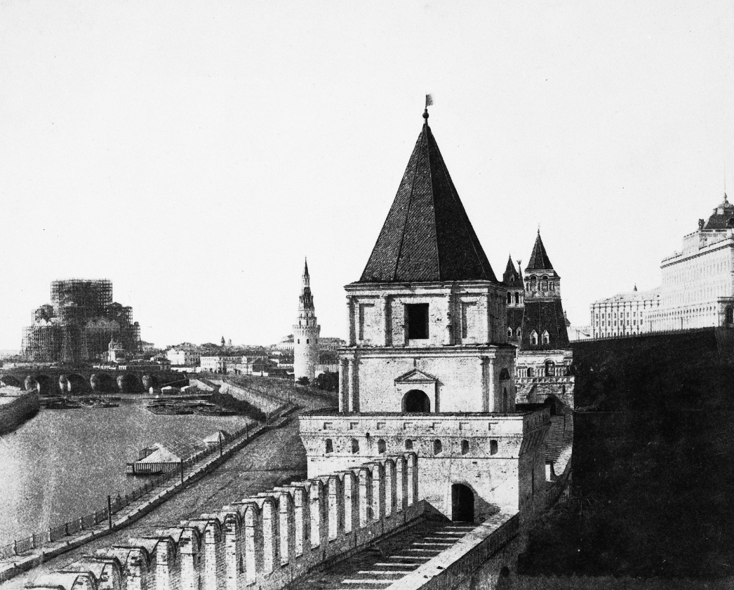 Вид из Кремля на строящийся храм Христа Спасителя, Москва, 1852 год. Фотограф Роджер Фентон. Снимок сделан на вощеной бумаге. Храм Христа Спасителя, или Храм Рождества Христова, — кафедральный собор Русской православной церкви, расположенный в центральной части Москвы на улице Волхонке. Российская империя.