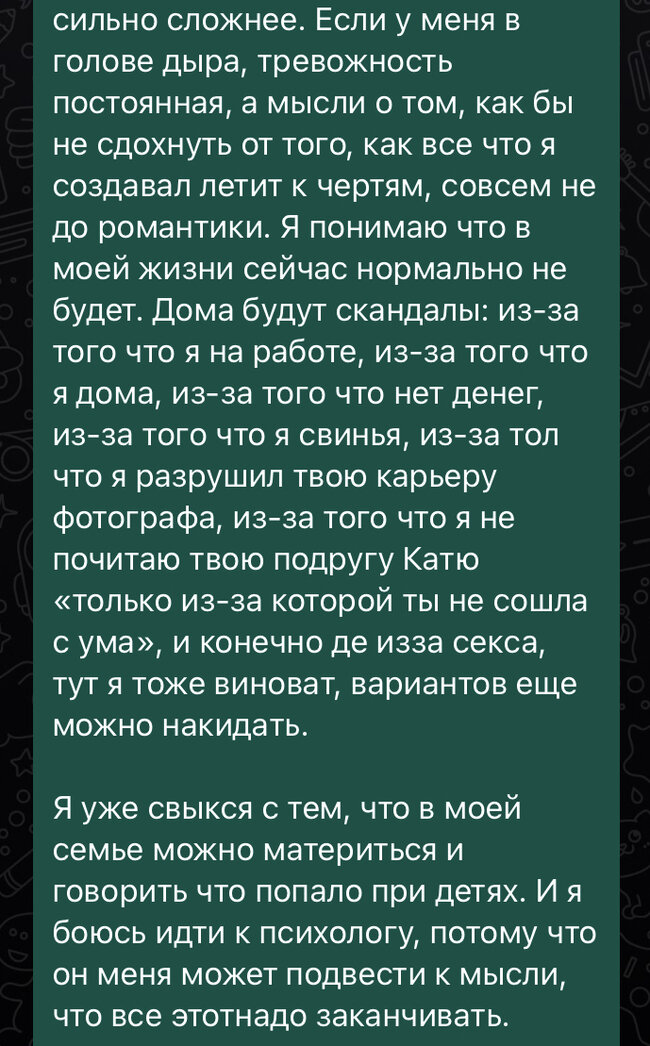 Вчера написал про свои планы на год. Много вопросов касалось нервотрепки со стороны жены. Она со мной не разговаривала сутки, из-за того, что увидела у меня в телефоне, что я смотрю порно. Пол, при живой жене такие истории - ты виноват и все такое прочее. Вчера я писал, что дом перестал быть для меня безопасным местом, я в постоянном напряжении из-за того что может произойти какой-то очередной скандал. Вчера старший сын (4 года) подошел к нам, сказал, что он боится плохих снов. Жена сказала что выпорет его до синей спины, норда он начал говорить, что ему правда тяжело уснуть, жена сказала, что завтра она продаст его любимую плюшку для катания на снегу из-за того, что он не спит. Я в полном ахере от таких историй, но раньше я не вмешивался, так как это сын от первого брака. Я очень его люблю, он живет со мной полтора года. Я сказал ей, что она на пустом месте наносит малышу психологические травмы. В этот момент она начинает рассказывать, что ее мама еще жёстче ее воспитывала. Мама сейча