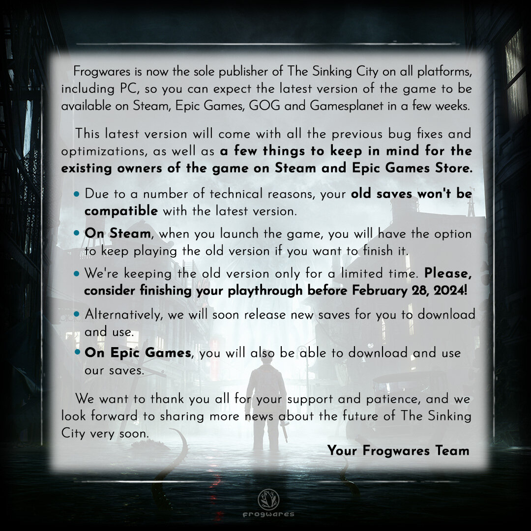 В посте на X разработчик Frogwares объявил, что теперь он стал единственным издателем вышедшей в 2019 году игры The Sinking City. Как результат, в ближайшие недели они обновят магазины, добавляя последнюю версию игры. В 2021 году Frogwares вступила в спор с компанией Nacon, издателем игры на ПК, по поводу авторских прав и невыплаченных роялти. В результате The Sinking City была удалена с ПК, Xbox One и PS4. Затем она вернулась в Steam, но ее опять удалили, так как это была якобы взломанная версия от Nacon. Пока неясно, что привело к разрешению спора. Но разработчик лишь сказал: Мы рады наконец оставить всё это позади и с нетерпением ждем возможности поделиться новостями о будущем франшизы. Frogwares предупреждает, что сохранения от старой ПК-версии будут несовместимы с обновлённой. Также они планируют выпустить новое DLC под названием Merciful Madness, которое будет работать только с новой версией. В то время как Frogwares больше всего известна по серии игр про Шерлока Холмса, The Sink