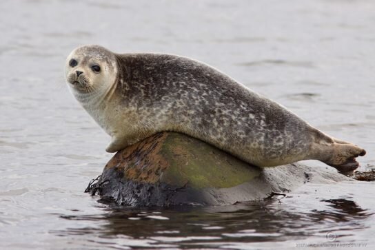 Тюлень обыкновенный (лат. Phoca vitulina) – это животное, которое относится к отряду ластоногих, семейству настоящие тюлени. Тюлень обыкновенный – хищник. Внешний вид Туловище этих животных вытянутое, его форма похожа на веретено. Голова имеет овальную форму. Морда небольшая. Глаза тюленя выразительные и всегда тёмные. Передние конечности короткие. У животных есть клыки. Длина туловища может варьироваться от 1,6 до 1, 9 м. Тюлень обыкновенный является небольшим представителем ластоногих, максимальная масса хищника – 150 кг, а минимальная – 60. Окрас животного сероватый. На всем теле расположены тёмные пятна. Зачастую у особей есть чёрные пятна на морде и голове. Окрас новорожденных идентичен с окрасом взрослых хищников. Половой диморфизм выражен лишь размерами: самцы крупнее особей женского пола. Морда этого животного похожа на кошачью, у тюленей даже есть усы – вибриссы, которые окрашены в белый. Они расположены на верхней губе тюленя в 10 рядов. Ареал обитания Тюлень обыкновенный