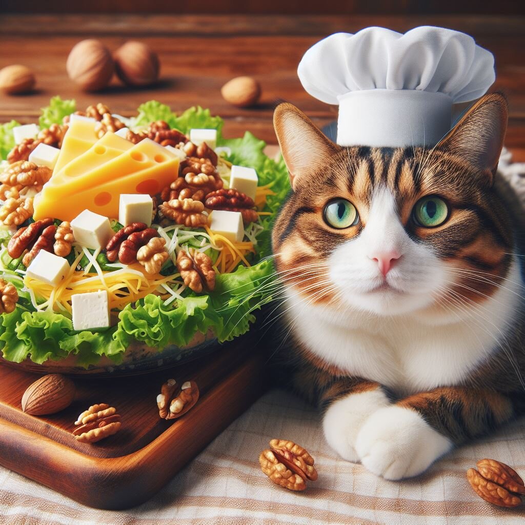 Привет, дорогие друзья! Сегодня мы с котиком Барсиком приготовим для вас легкий и полезный блюдо - салат с сыром и орехами. Это отличный вариант для тех, кто хочет сбалансировать свое питание и получить много витаминов и минералов. А котик Барсик будет участвовать в нашем процессе и носить головной убор повара. Для приготовления этого блюда нам понадобятся следующие ингредиенты: - 200 г зеленого салата (руккола, латук или другой на ваш выбор) - 100 г сыра (фета, брынза или другой на ваш выбор) - 50 г орехов (грецкие, кедровые или другие на ваш выбор) - 2 ст.л. оливкового масла - 1 ст.л. лимонного сока - соль, перец, травы по вкусу Способ приготовления: 1. Вымойте и обсушите салат. Нарвите его на небольшие кусочки и переложите в большую миску. Нарежьте сыр на кубики или разломите на кусочки. Добавьте сыр к салату и перемешайте. 2. В сухой сковороде на среднем огне поджарьте орехи, помешивая, около 5 минут, пока они не станут золотистыми и ароматными. Осторожно переложите орехи на д