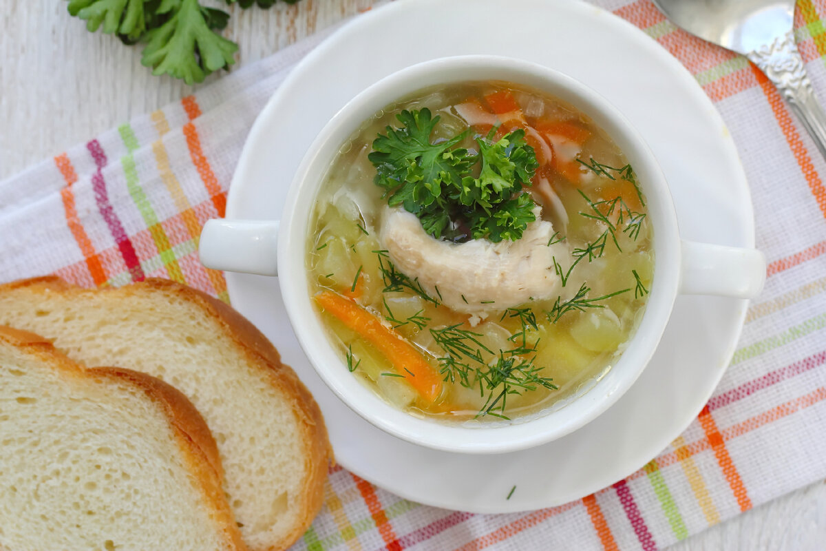 В январе желудок устал от новогодних застолий. Самое время проявить заботу и придумать что-то приятное и полезное для скорейшего возвращения к нормальному питанию. Пусть будет суп! Что потребуется? Курица (желательно цыпленок) – 1 шт. Вода – 1,5 литра Помидоры - 2 шт. Перец сладкий - 1 шт. Морковь - 1 шт. Лук репчатый - 1 шт. Сельдерей - 1 шт. Чеснок - 5 зубчиков Имбирь корень - 1 ч. л. Соль - 2 щепотки Лавровый лист - 2 шт. Гвоздика - 2 шт. Что делаем? Шаг 1. Разрезаем курицу на кусочки, чистим и нарезаем овощи. Все помещаем в кастрюлю и заливаем водой, солим, кладем лавровый лист, гвоздику, тертый имбирь и зубчики чеснока. Шаг 2. Варим час на среднем огне. Даем настояться 20 минут под крышкой. Шаг 3. Подаем с хлебушком. Едим и урчим от удовольствия. Приятного аппетита!